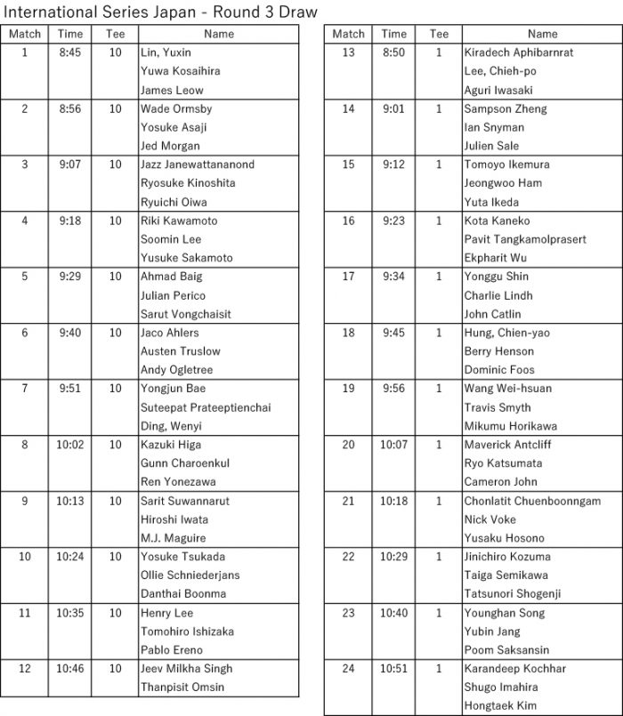 インターナショナルシリーズジャパン決勝1日目(4月4日)の組み合わせが決まりました。 掲載日 2026年4月3日 予選の順位や出場選手の詳細などは下記URLよりご確認いただけます。 Asian Tour | Professional Golf Tour in Asia